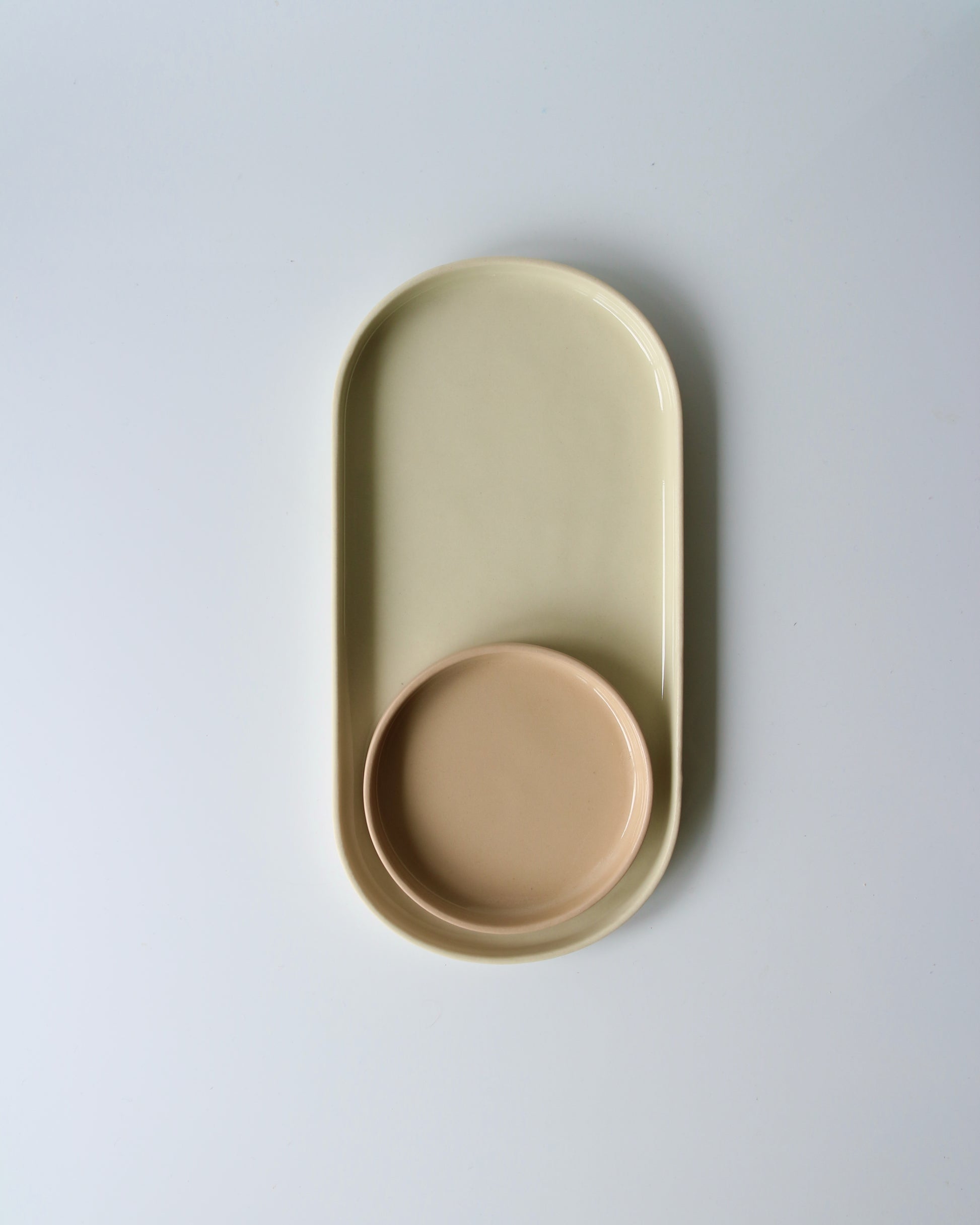 Hand-tinted porcelain. The color is mixed directly into the clay body, ensuring a deep, uniform tone. The interior is finished with a clear, food-safe, glossy glaze, resistant to cutlery marks. The exterior is left unglazed creating a smooth, matte, stone-like finish.