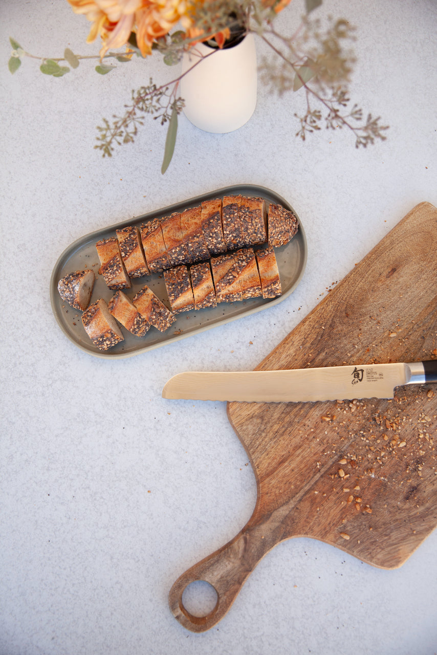A generous, elongated oval defined by its vertical walls. It works equally well as a shared platter or a countertop organizer.