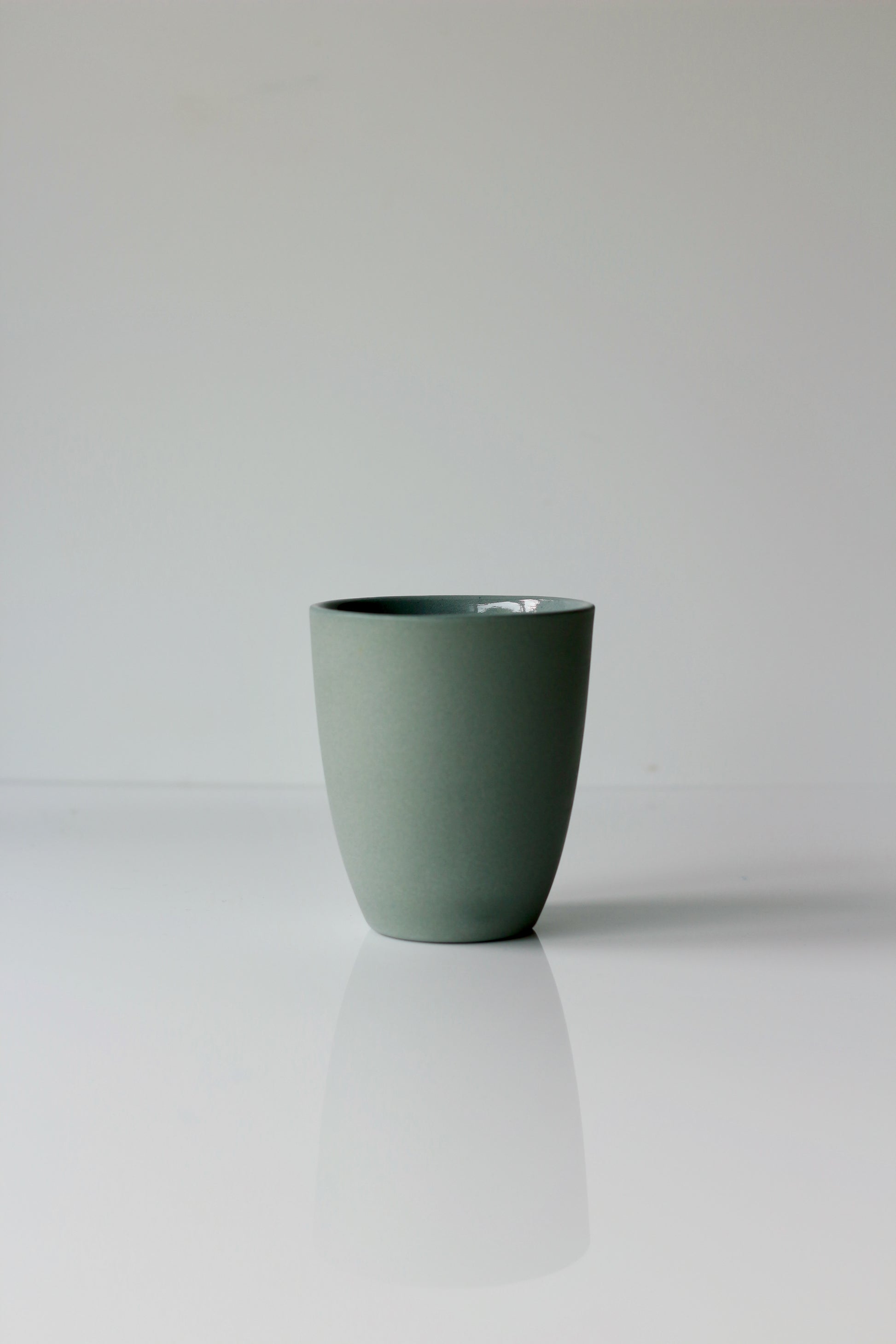 A gently tapered form designed to stack neatly. It is versatile enough for a morning latte, tea, or water at the dinner table. Its angled profile fits comfortably in the hand and saves space in the cupboard.